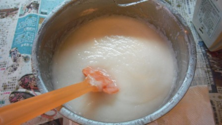 大約攪了1個小時,我發現電攪器已經不太攪得動了,拿湯匙挖了一下,應該可以進入下一步囉!