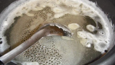 先把水煮滾,再將皂團撕成一小塊一小塊丟入水中煮到溶 (還不停地攪拌)